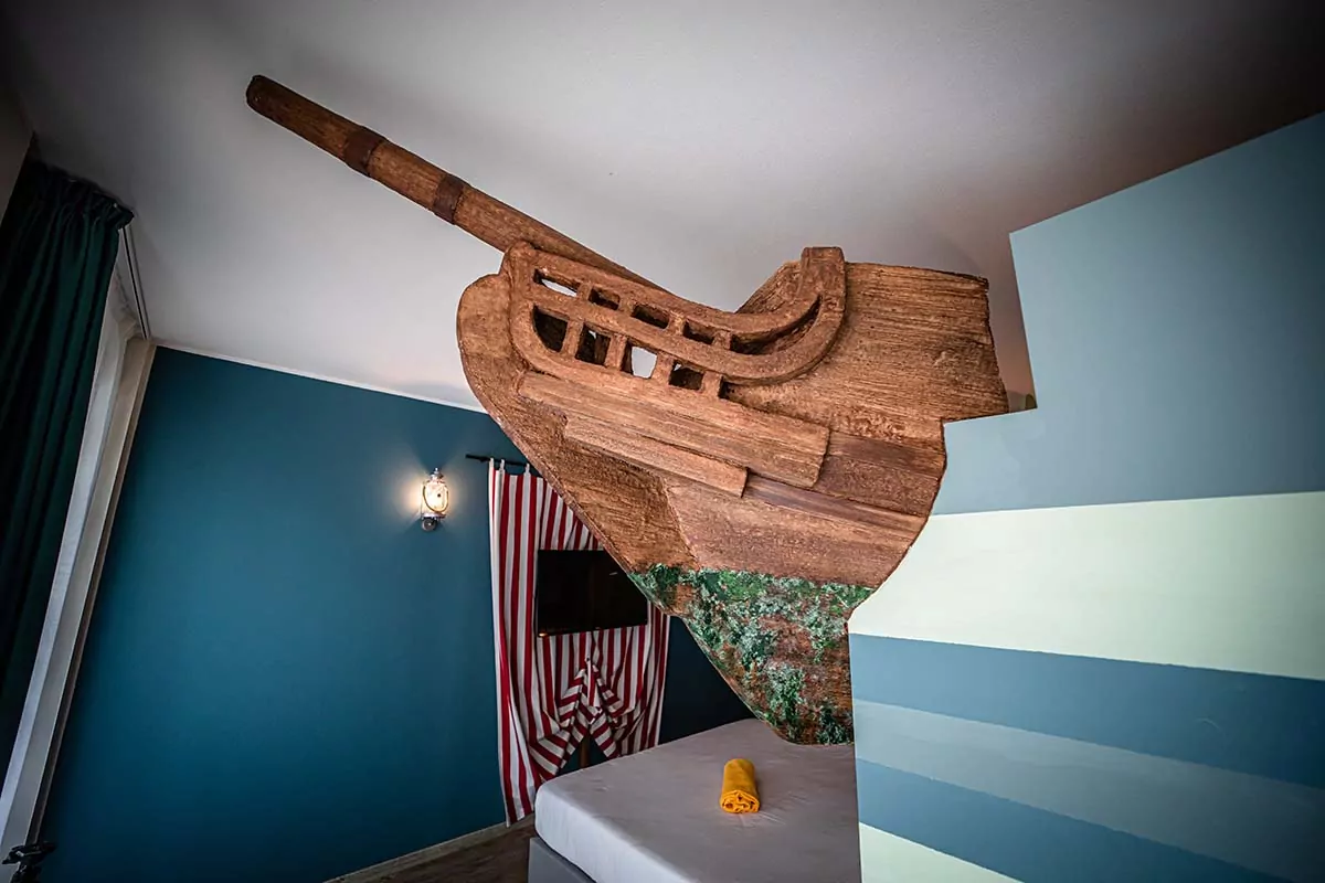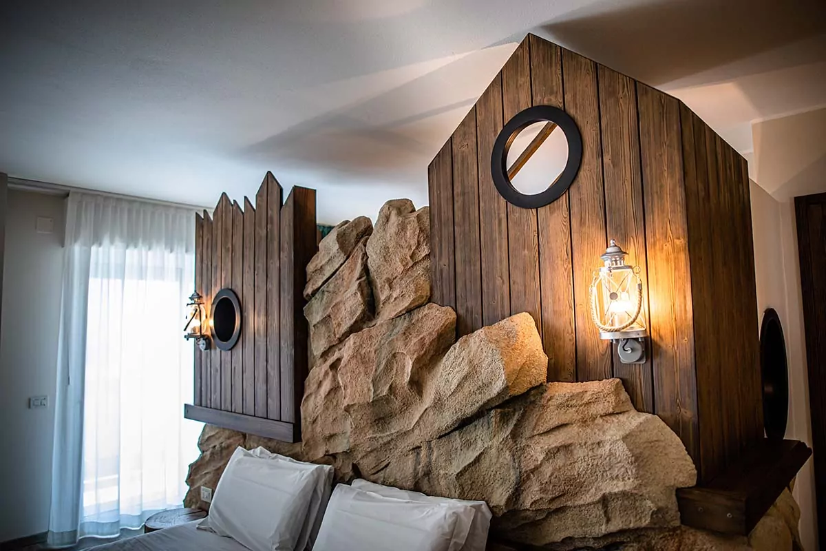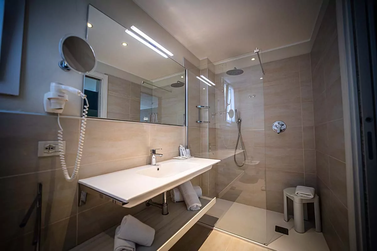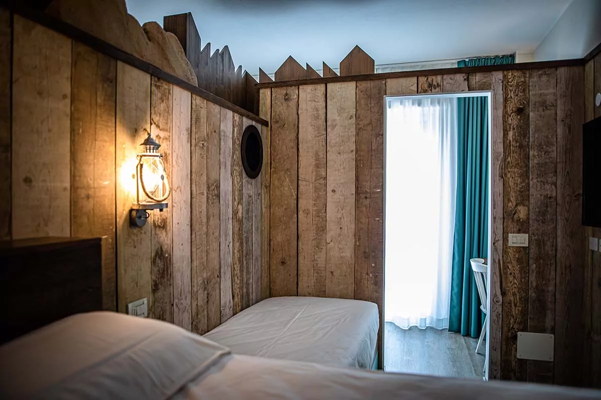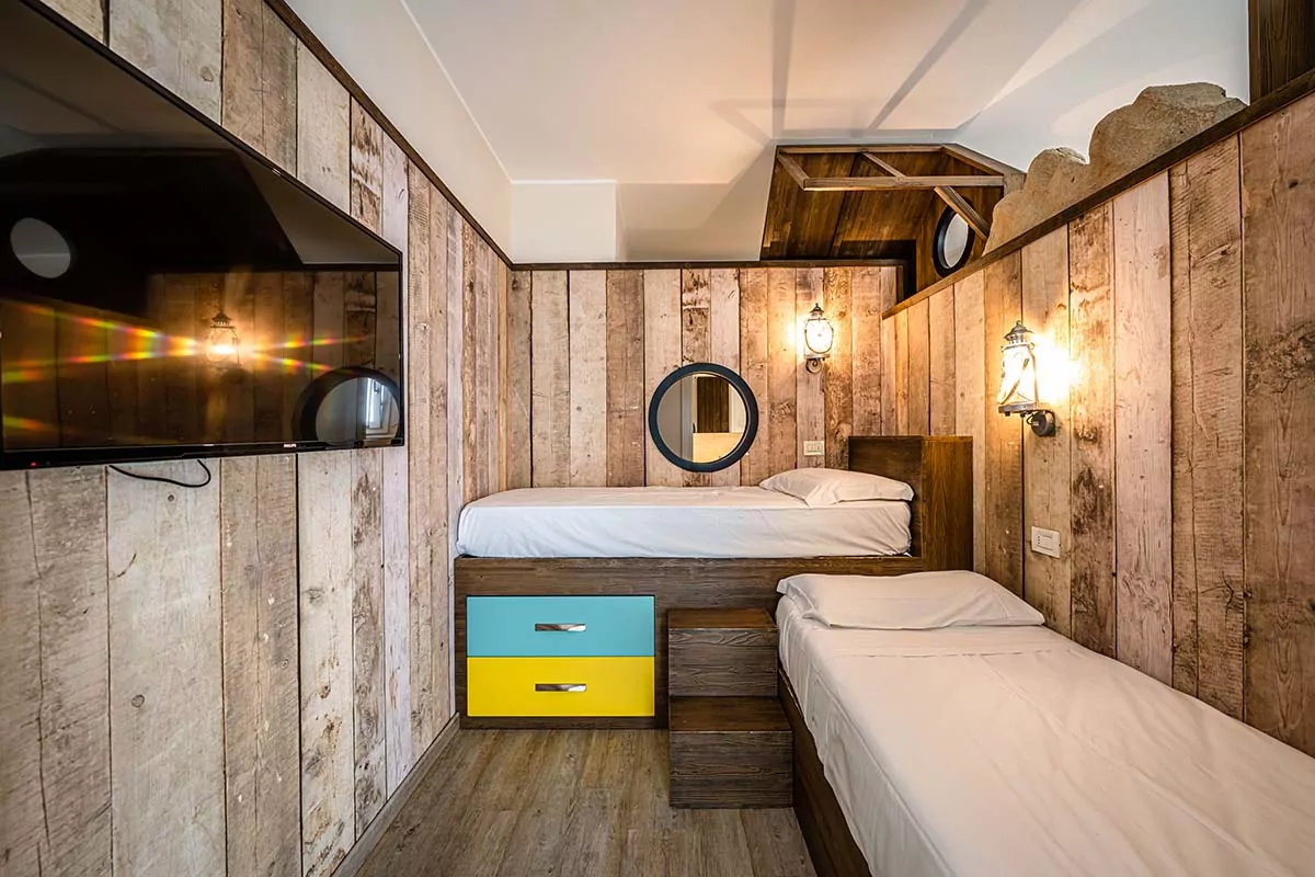 This room features a double bed and a children’s sleeping area, and comes complete with air conditioning, heating and a large bathroom with a shower enclosure (80x150cm), as well as a hair-dryer, a mini-bar, a telephone, a wireless internet connection, a safe, a terrace with a table and 3 chairs, 2 LCD TVs, beach towels and even your preferred newspaper.